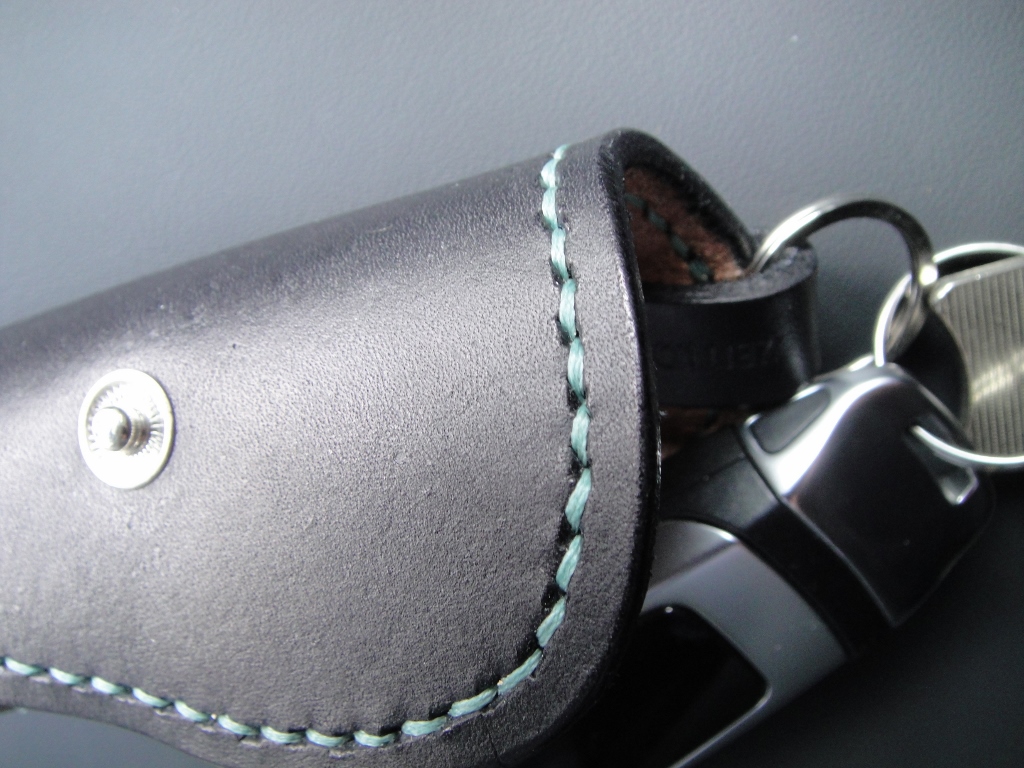 Sämtliche Herstellungsschritte sind in Handarbeit durchgeführt. Die präzise ausgeführten Nähte in der Kontrastfarbe türkis sorgen nicht nur für die Langlebigkeit des Etuis, sondern sind mit dem silberfarbenen Schlüsselring und dem silberfarbenen Druckknopf zugleich eine schöne Verzierung.